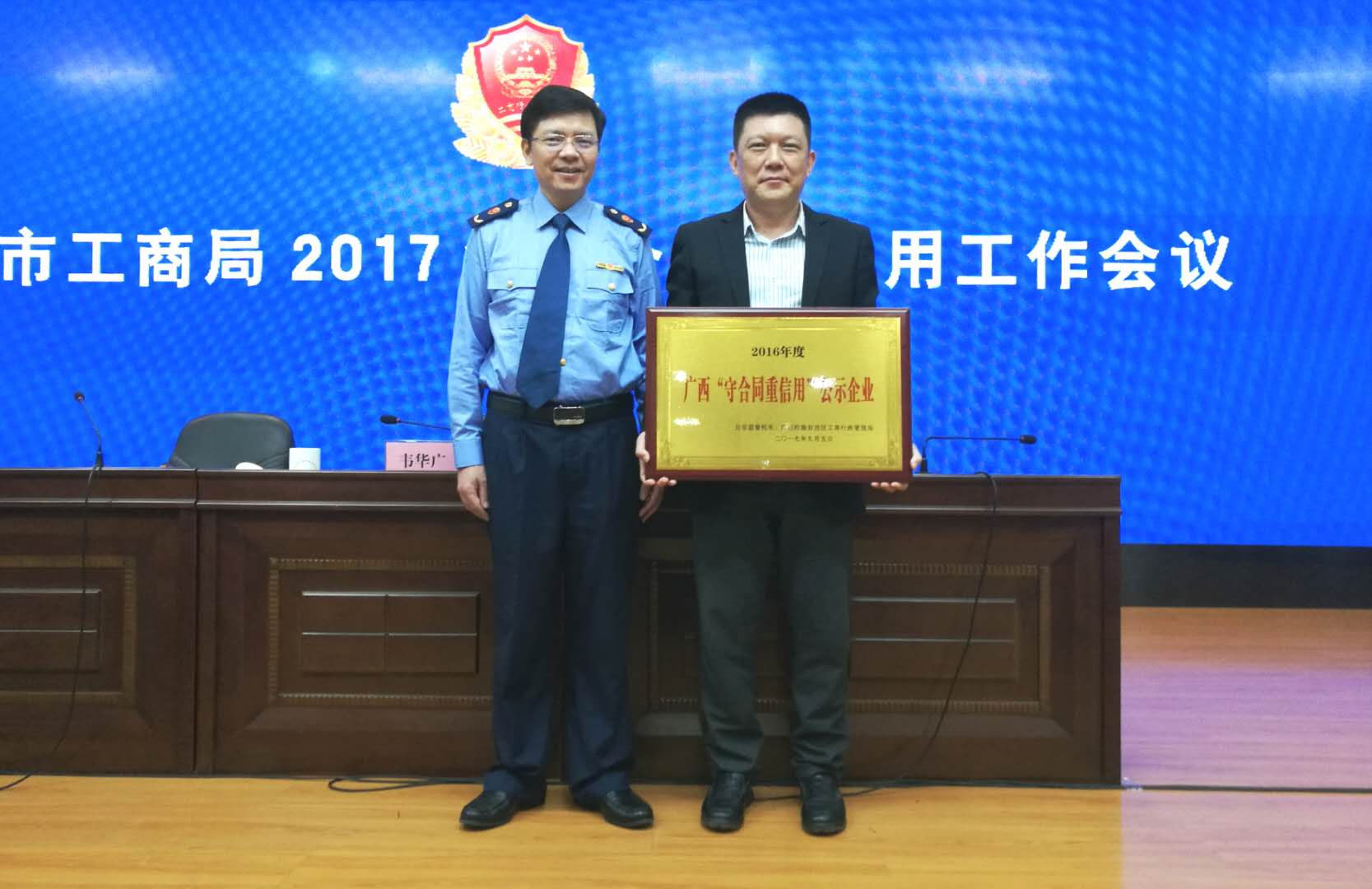 好消息!10月27日上午,在柳州市工商行政管理局召開的2017年度守合同重信用工作會議上,柳州市家居建材博覽中心有限公司榮獲了2016年度“廣西壯族自治區守合同重信用”公示企業榮譽稱號,市工商局副局長韋華廣給柳州家居領獎代表——總裁助理劉小兵頒發榮譽匾牌。此項殊榮的獲得為柳州家居再添一張亮麗名片。