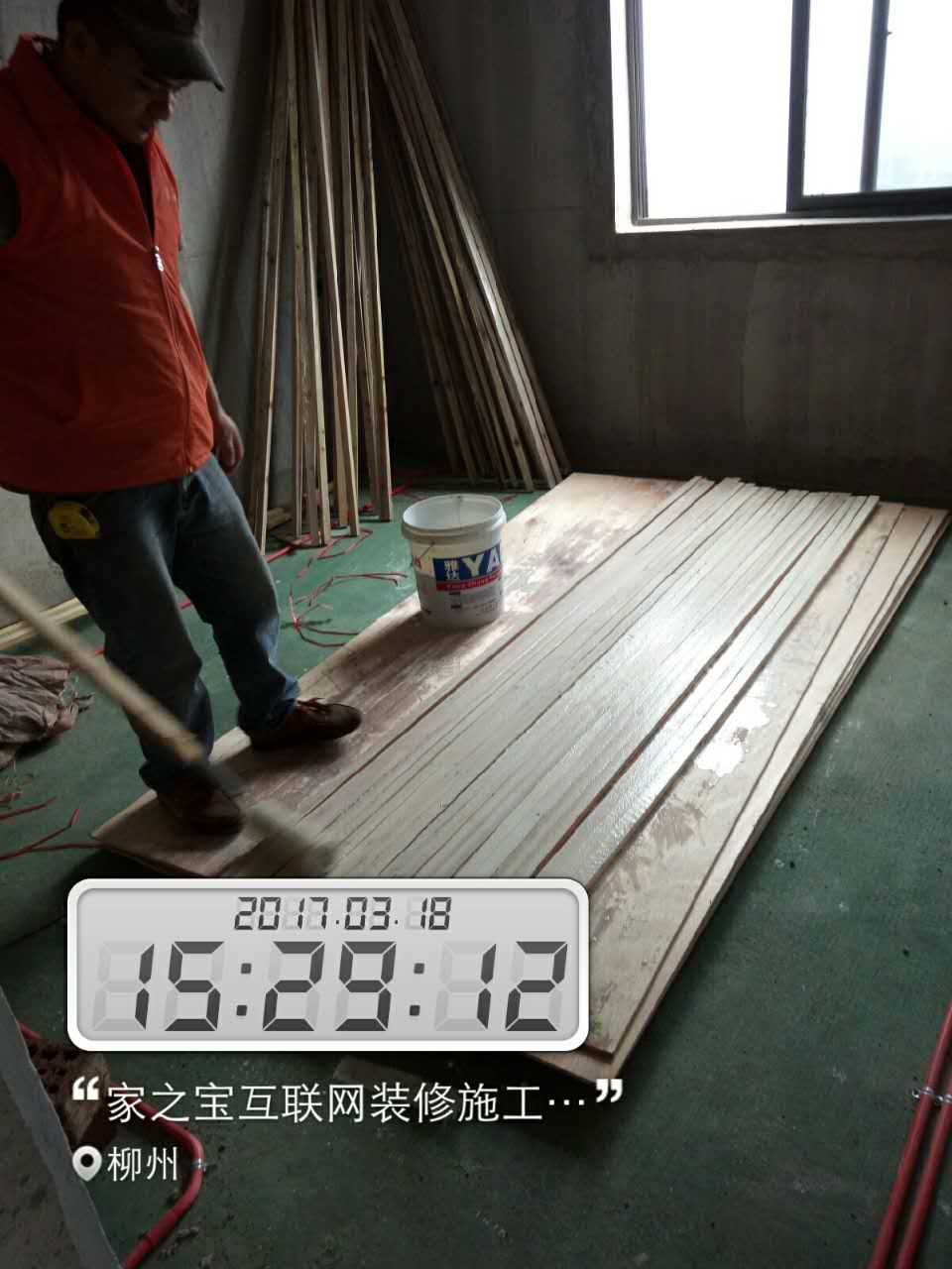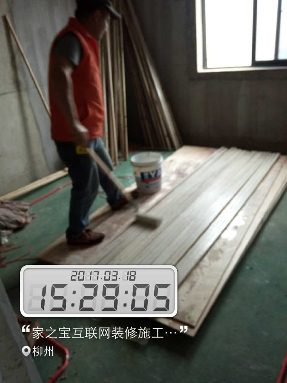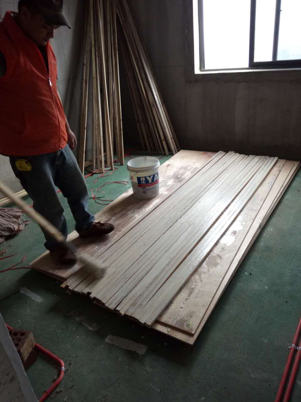 木工進場。木工在給方條刷防火涂料