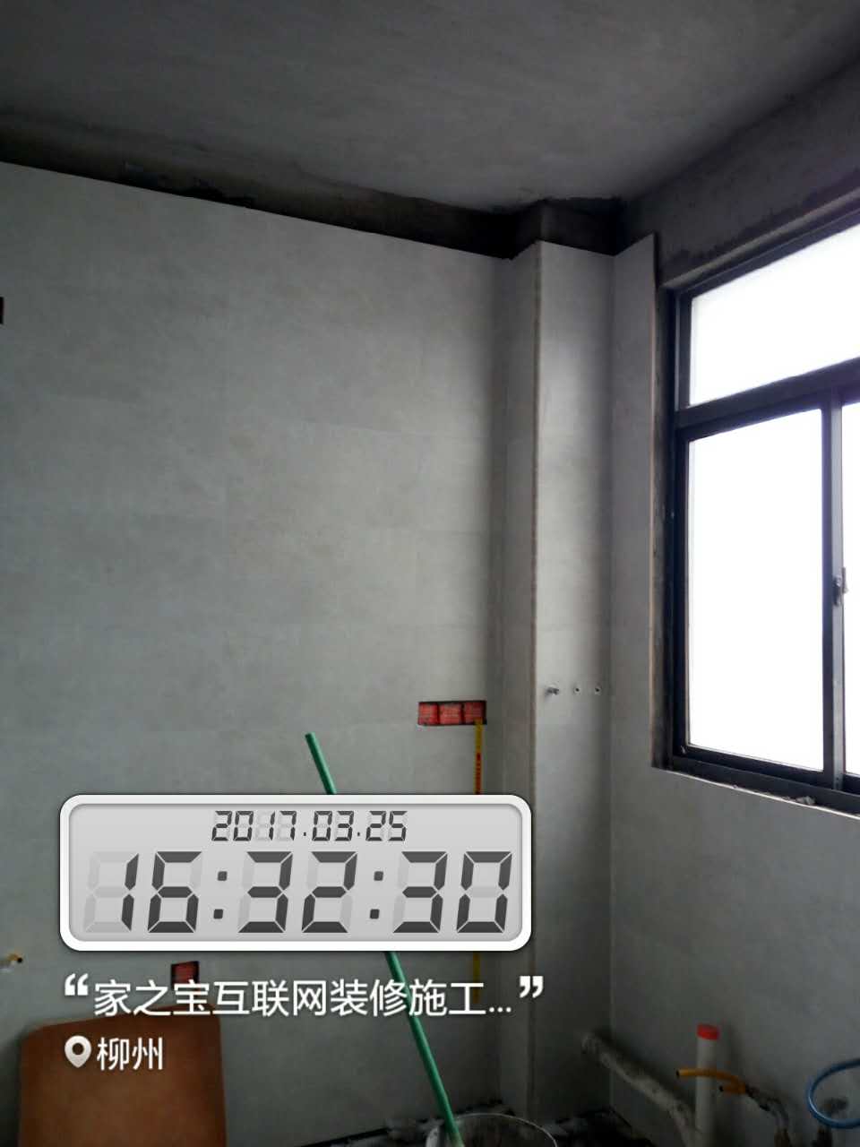墻磚鋪貼,使用水平儀投射水平線,陽角處采用磨邊45°碰角工藝。