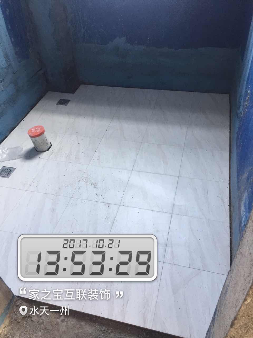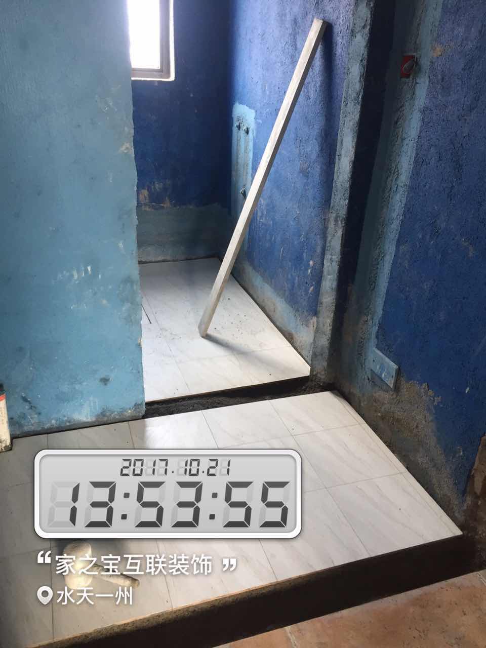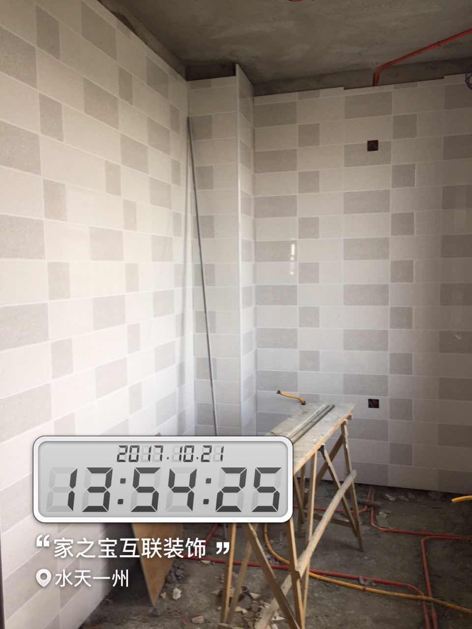 墻磚鋪貼,使用水平儀投射水平線,陽角處采用磨邊45°碰角工藝。